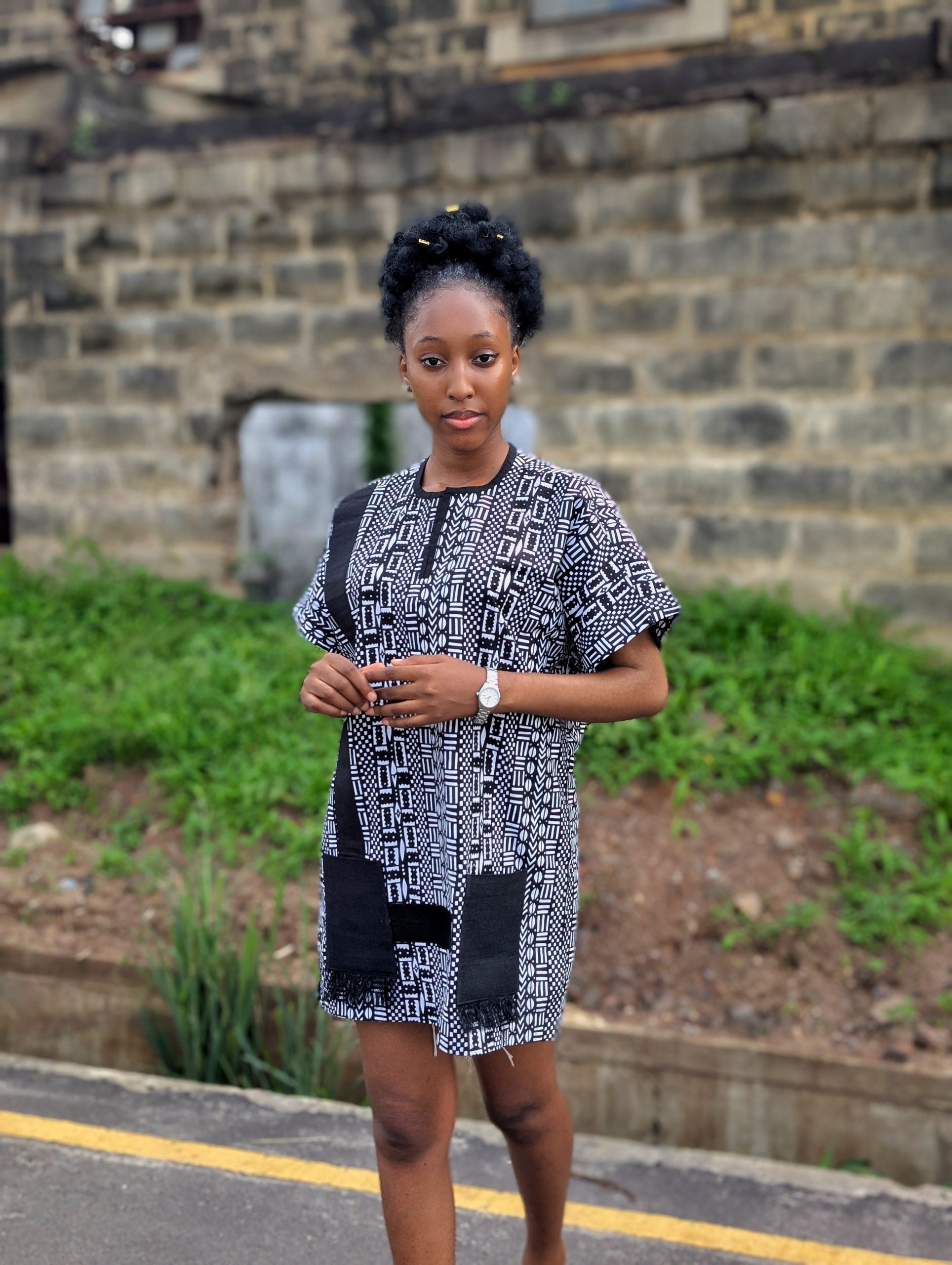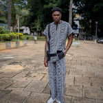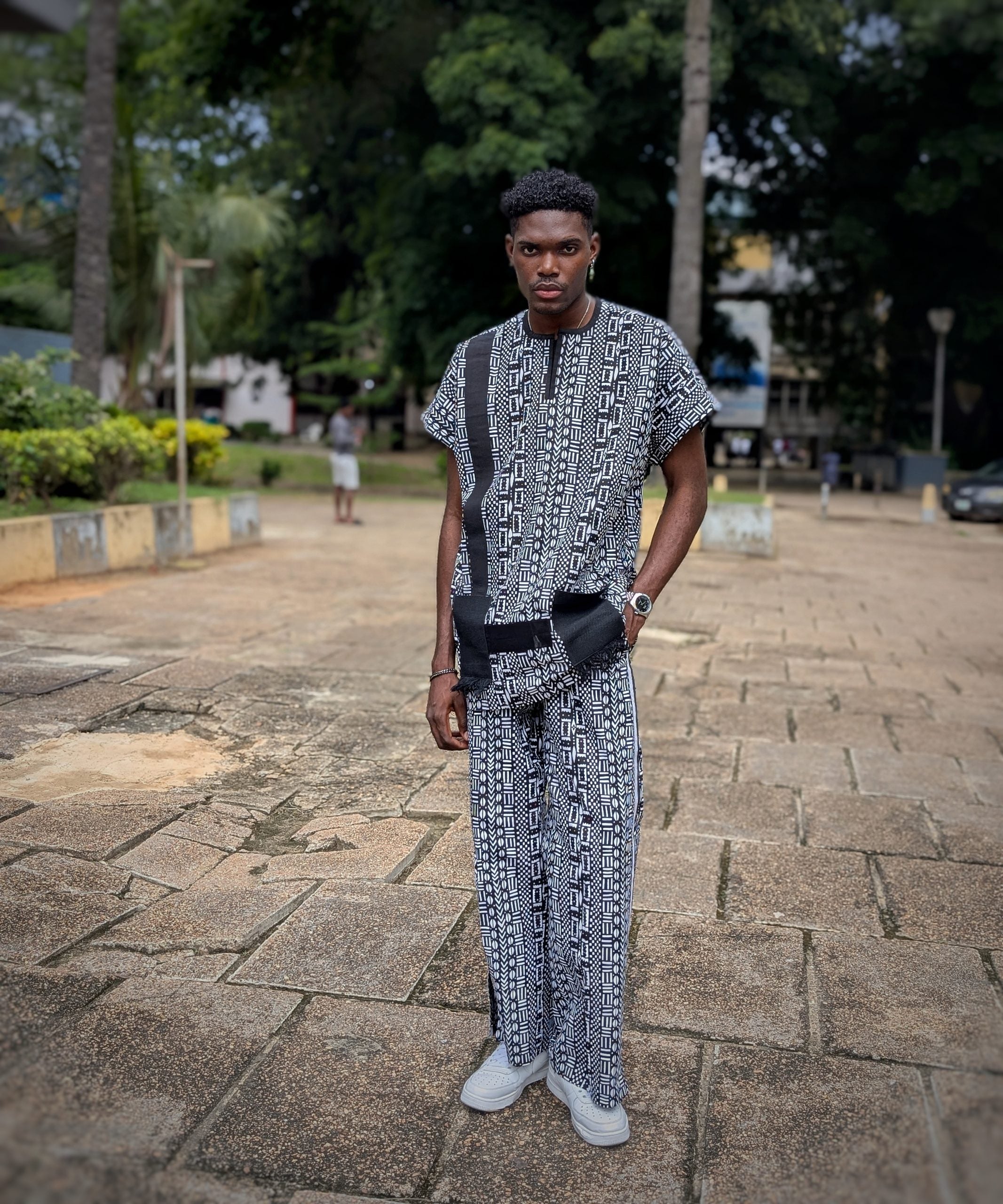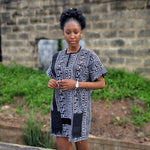 A wax print canvas in motion, grounded with Aso-Oke pockets and patches,